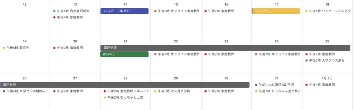 これは私が10日間で日商簿記2級に合格した時のGoogleカレンダーです。